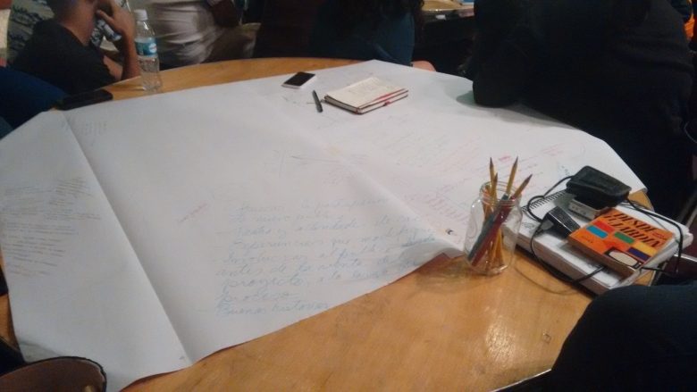 Así como en la Edad Media, el rey y sus caballeros se disponían alrededor de una tabla redonda para discutir asuntos cruciales sobre la seguridad de sus imperios, 4X4 Producciones colocó unas mesitas redondas de madera en el Trasnocho Lounge del Trasnocho Cultural para debatir sobre la seguridad del propio reino de los gestores culturales. La diferencia son las armas: el papel bond y los marcadores de colores que invitan a los participantes a rayar sus ideas y compartirlas con los demás.