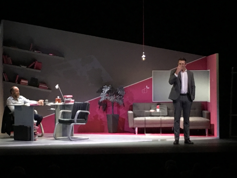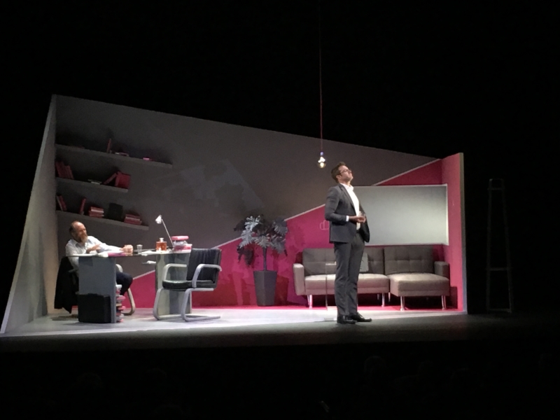 En tercer lugar, el ambiente. Todo rosado y asimétrico. En el escenario se crea un desbalance, –en conjunto con los movimientos de escena– demasiado obvio y en ocasiones aburrido, que asume el discurso de la antipolítica y presume de dejar pistas al espectador de lo que va a suceder. El batacazo final es contundente y el vídeo innecesario.