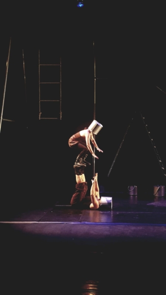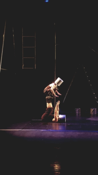 Una pareja de acróbatas, Morgane Jaudou y Marcos Rivas, dirigidos por Pablo Ibarluzea, convierte el escenario en un espacio de juego en el que el primer personaje que se ve es el miedo. Entran a escena con las cabezas escondidas en baldes vacíos, usados a modo de casco, y ojos expectantes, temerosos del exterior y sus riesgos. Hasta que por fin salen del fondo, separados del público por una malla de metal, y comienzan una historia que se parece mucho a la vida.