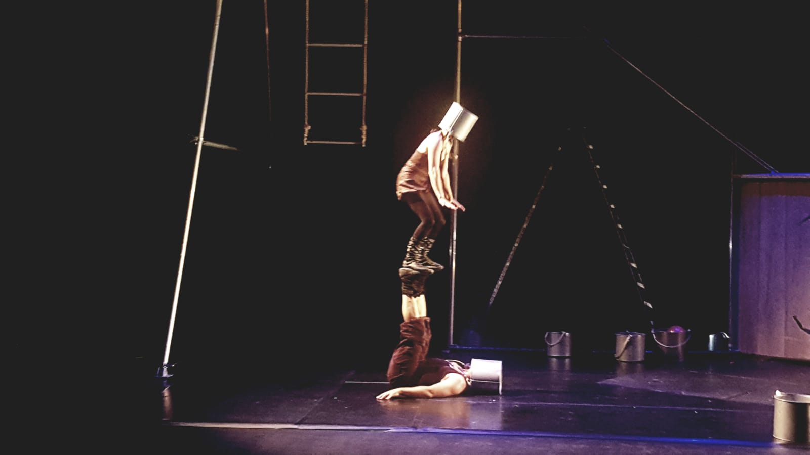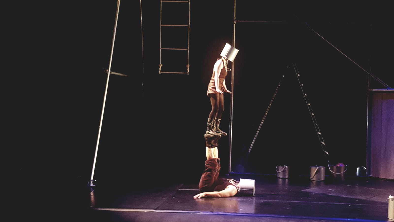 La filosofía de la compañía –que cuenta con numerosos espectáculos cosechados desde 2005– es “Hazlo y si te da miedo hazlo con miedo». De este modo, resisten sobre una estructura metálica, se balancean sobre una escalera de madera, discuten ante una pared en la que lanzan cuchillos y se arreglan subidos el uno sobre el otro conectados por un balde metálico. La realidad y la historia pendiendo del mismo hilo.