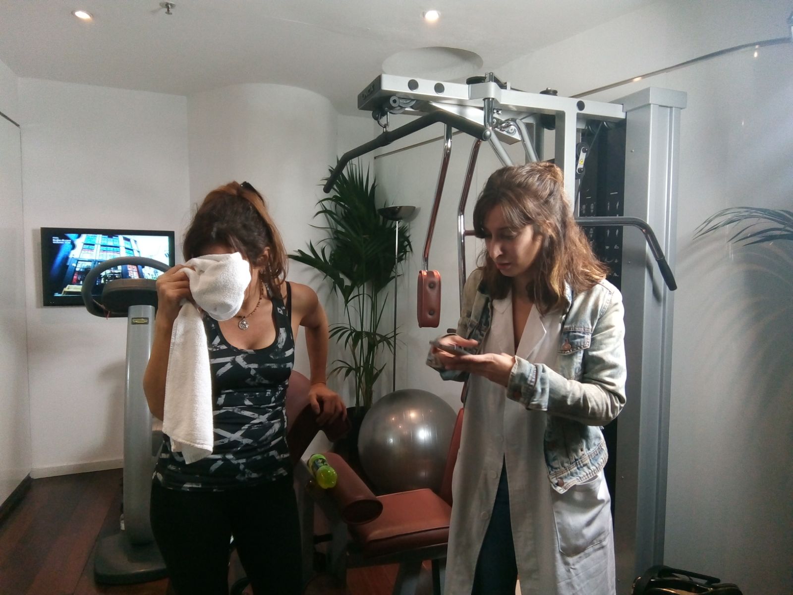 El segundo plato nos lleva a la sala del gimnasio con la propuesta de Inhalar helio. En esta pieza los espectadores estarán siempre de pie y formarán parte del espectáculo, las actrices se moverán entre el público sin romper la cuarta pared. La iluminación y la puesta en escena hacen un ambiente agradable.